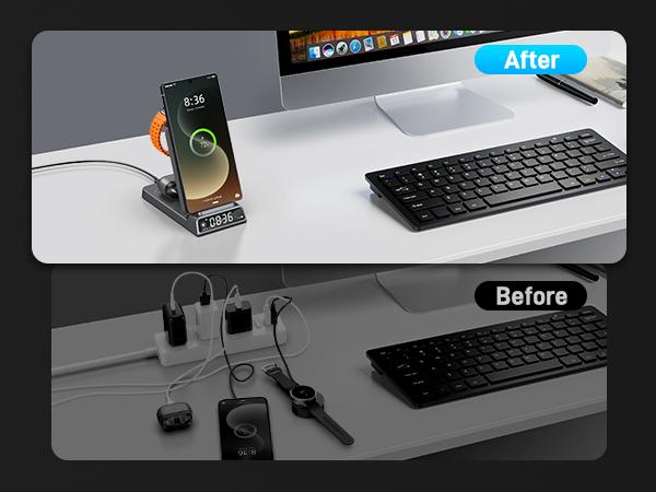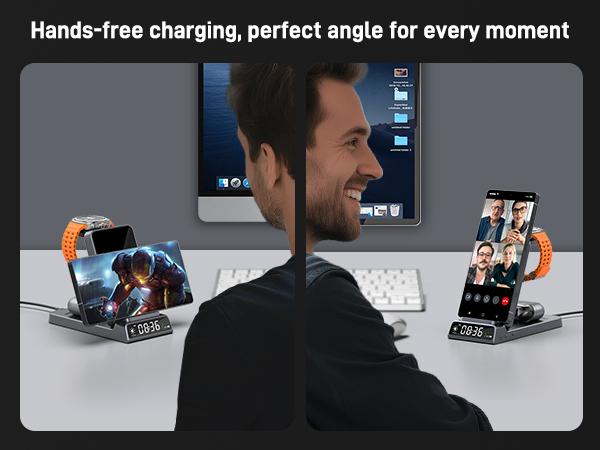 This 5-in-1 wireless charging dock can charge your phone, Samsung Watch, and Earbuds simultaneously. It supports all iPhones and Android phones, as well as headphones and iPads. Note: Samsung watches are only compatible. Features include an upgraded foldable stand with a digital clock display, three brightness levels, and a built-in induction coil for easy and convenient charging, eliminating messy cables. - Versatile: Suitable for home (kitchen, bedside table, desk), office, or travel.